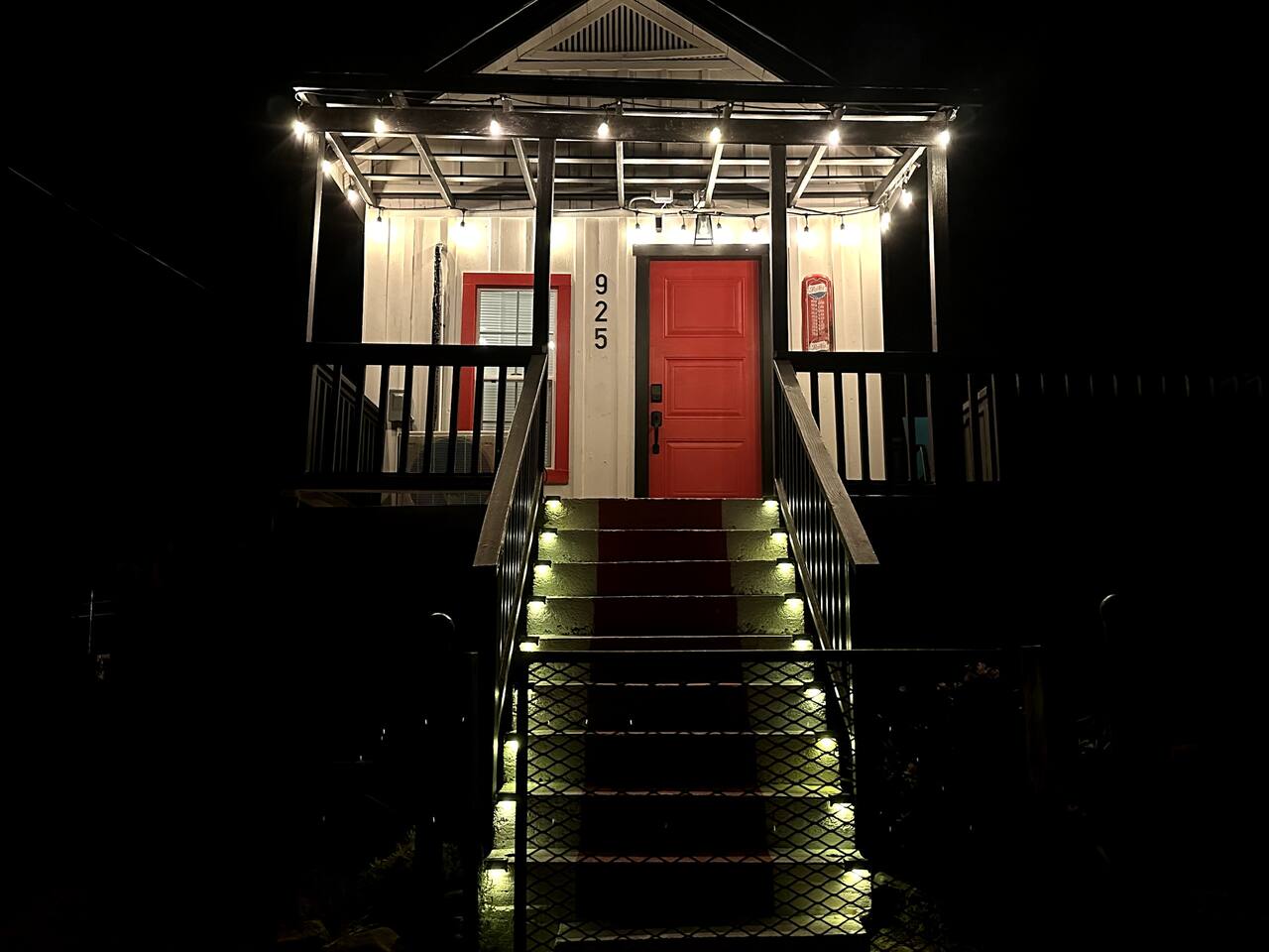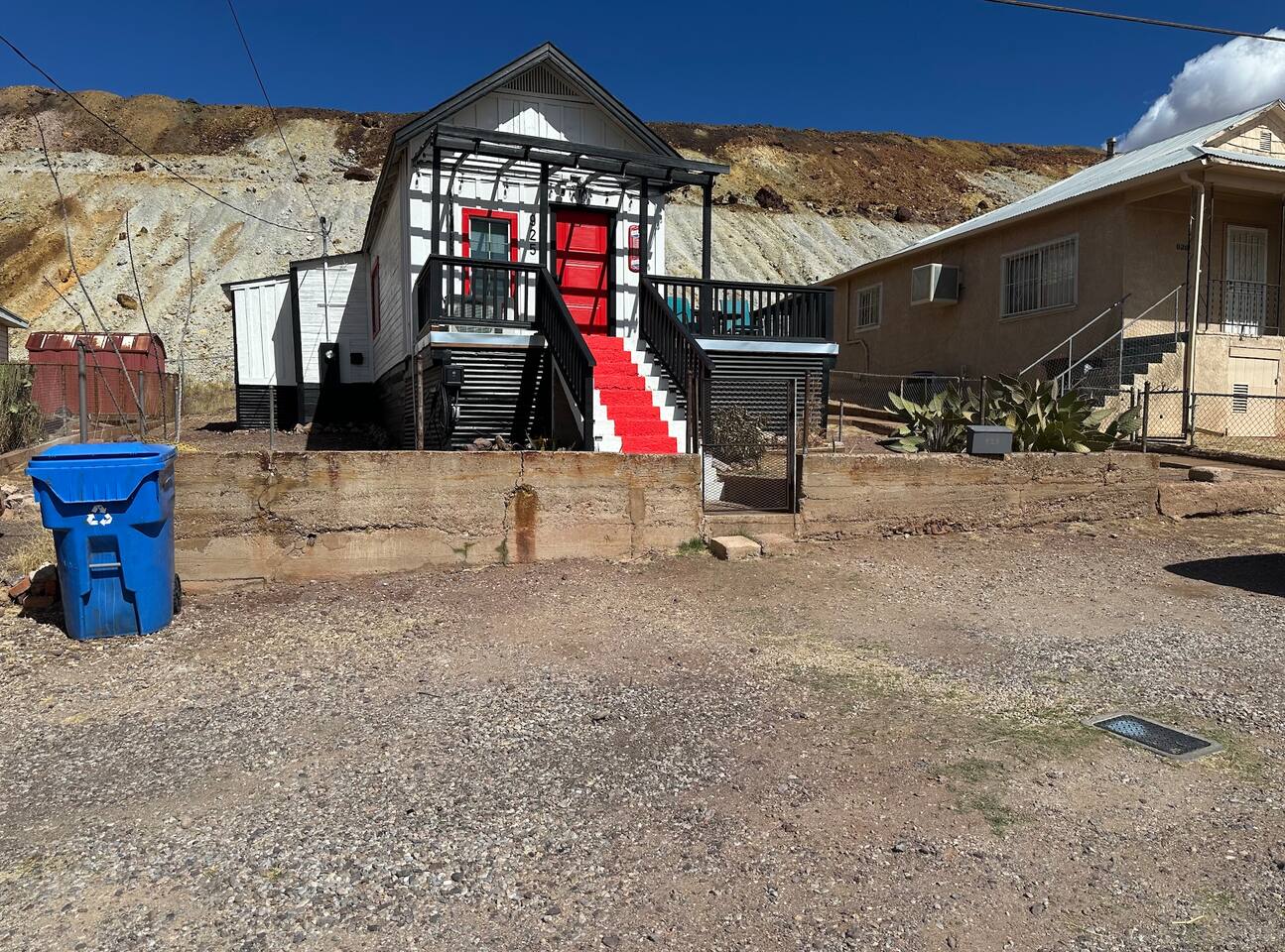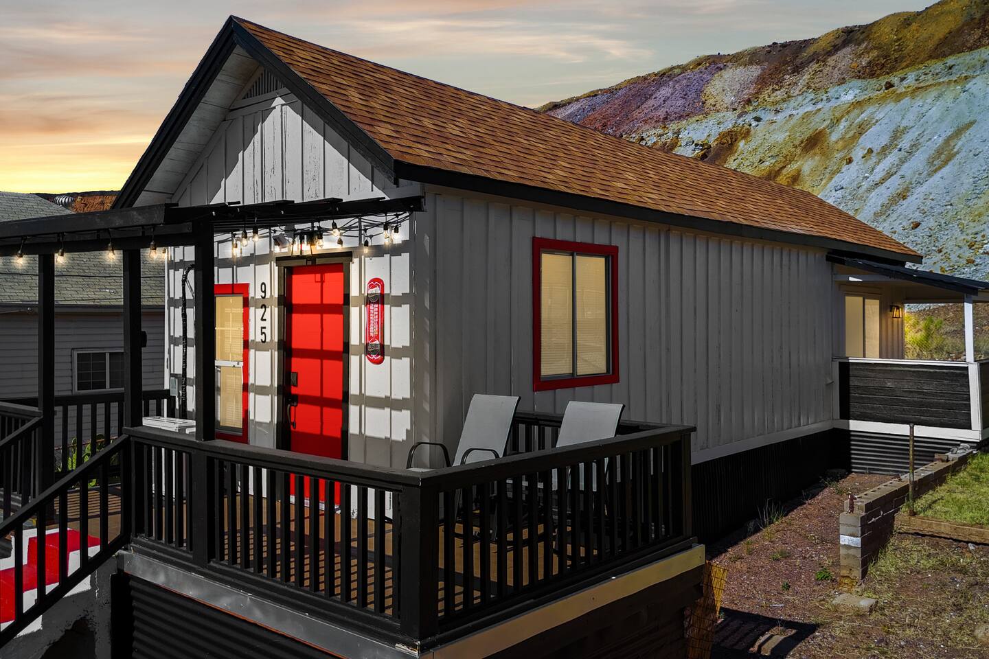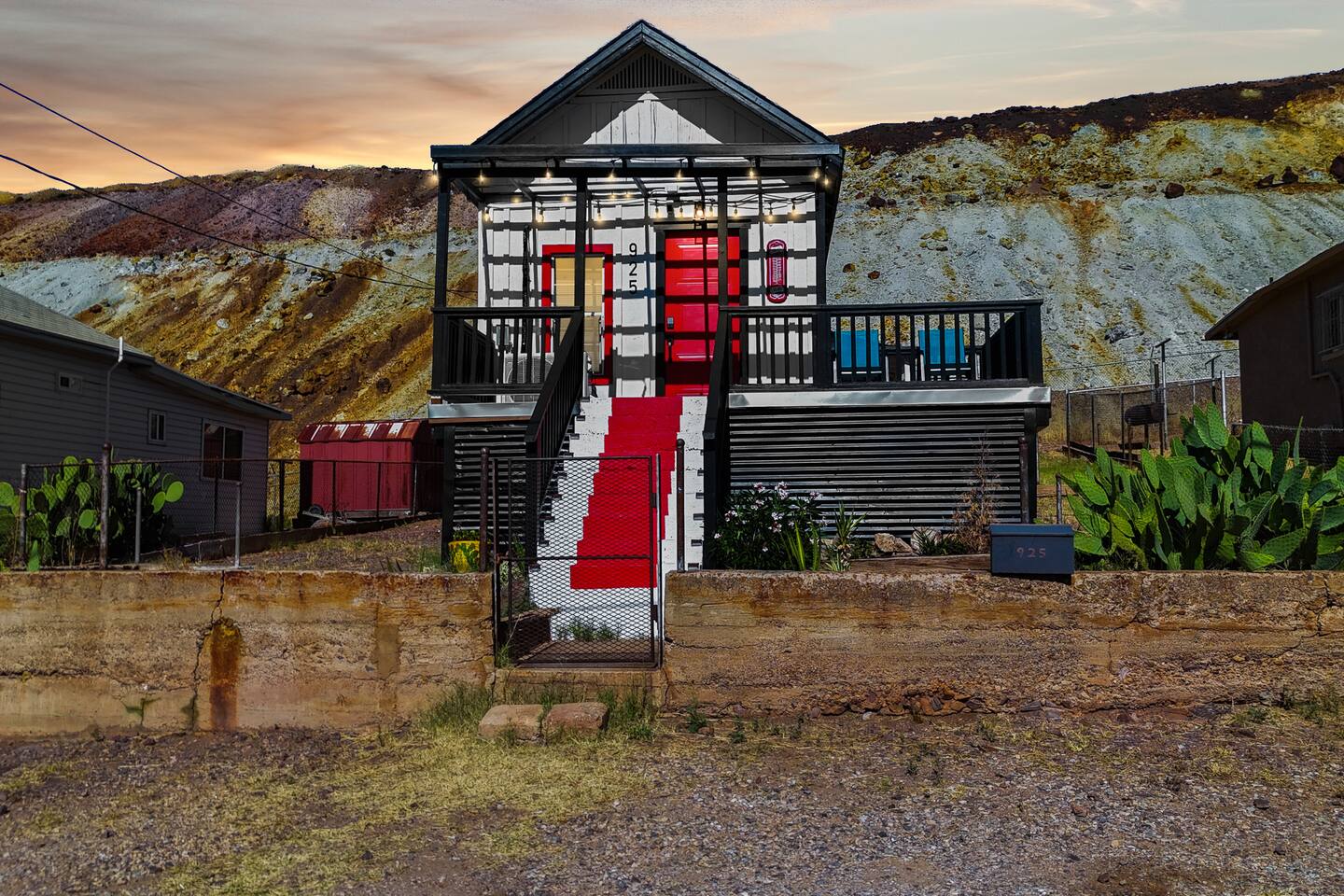 The Red Door Bungalow is a charming elevated home with a striking black-and-white exterior and a bold red door. Inside, the open-plan living room flows into a modern kitchen, featuring comfortable seating, a sofa bed, flat-screen TV, and a dedicated coffee bar. The bedrooms are thoughtfully designed with modern decor and colorful accents, creating a welcoming retreat after a day of exploring Bisbee.