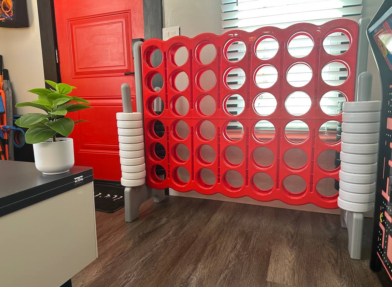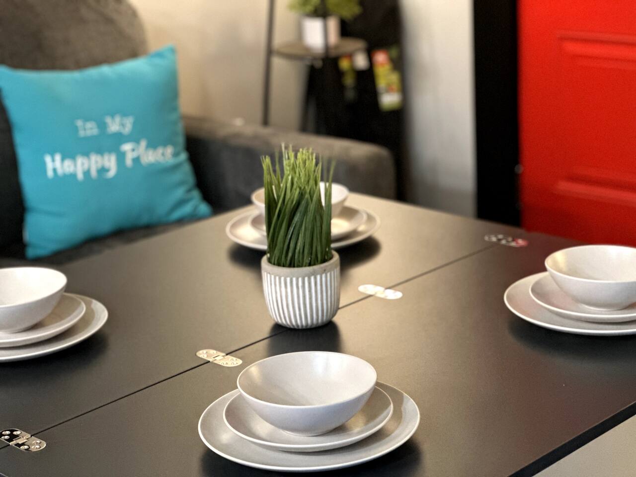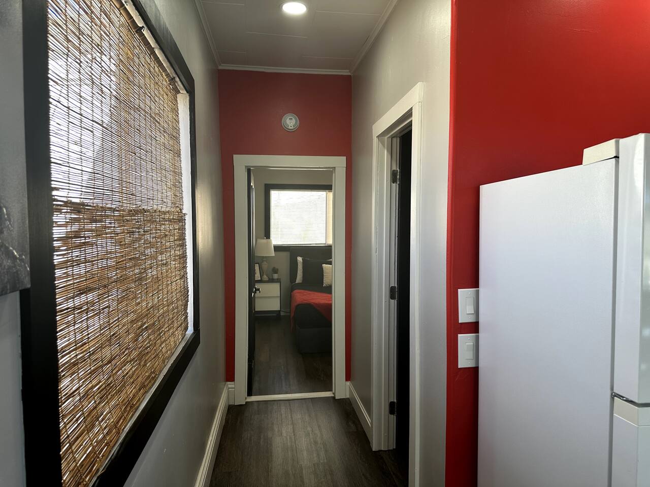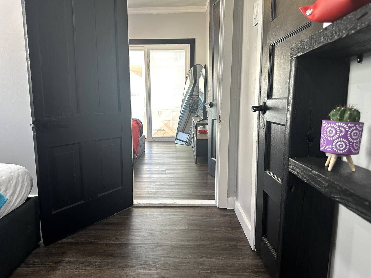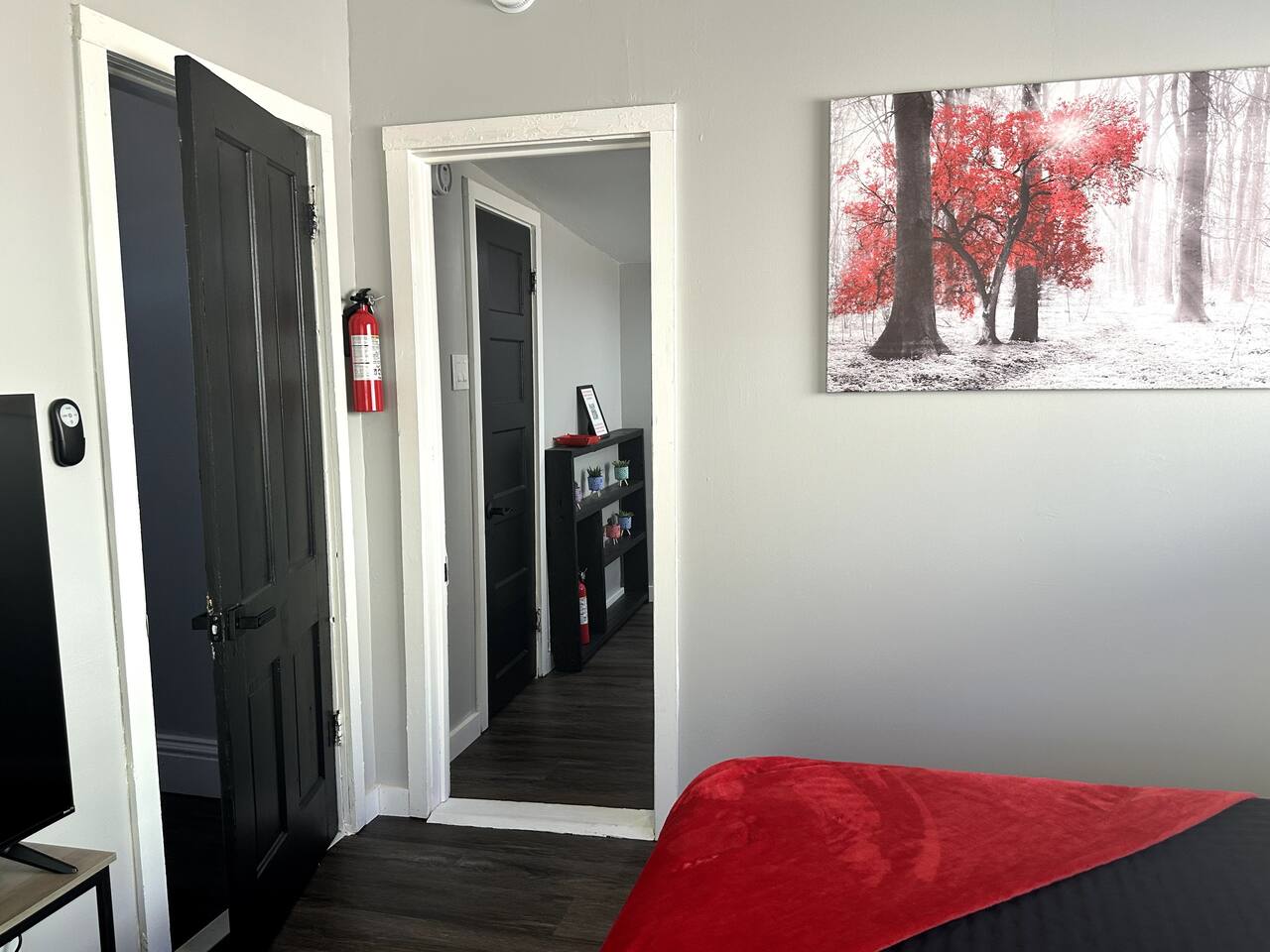 The Red Door Bungalow is a charming elevated home with a striking black-and-white exterior and a bold red door. Inside, the open-plan living room flows into a modern kitchen, featuring comfortable seating, a sofa bed, flat-screen TV, and a dedicated coffee bar. The bedrooms are thoughtfully designed with modern decor and colorful accents, creating a welcoming retreat after a day of exploring Bisbee.